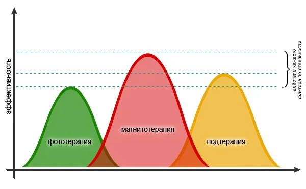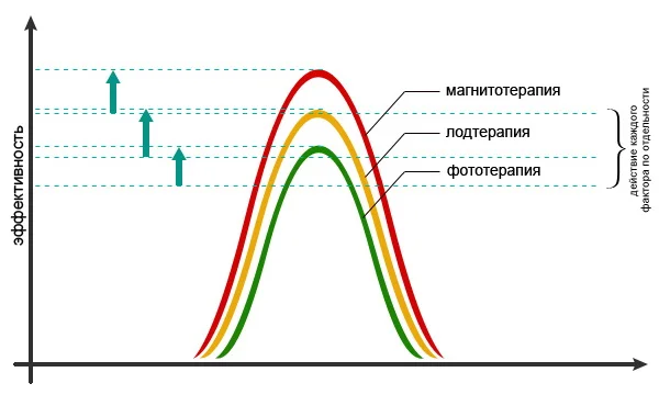 Рис. 2 Явления суммации и взаимоусиления (потенцирования действия) реализованные в аппарате магнитофотобаротерапии «АндроСПОК»