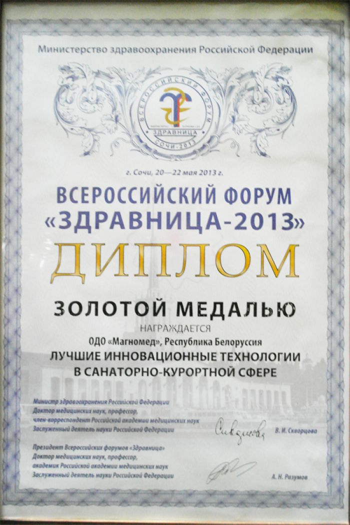 • Золотая медаль на выставке «Здравница 2013» в РФ
