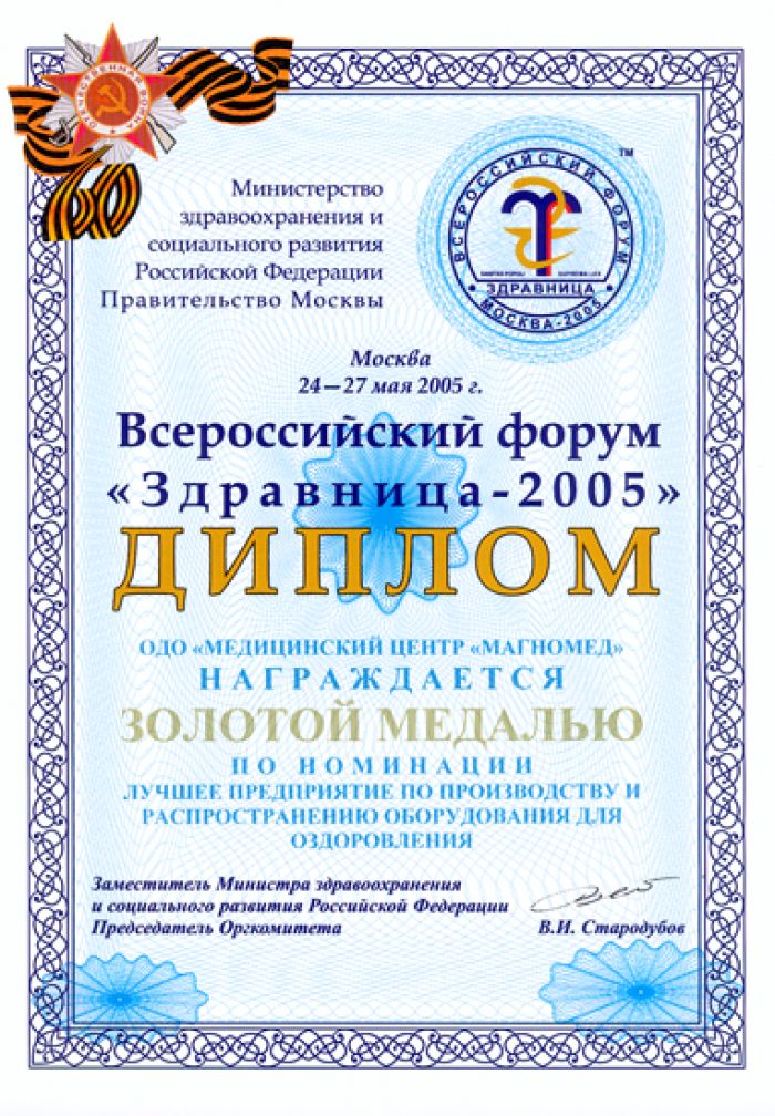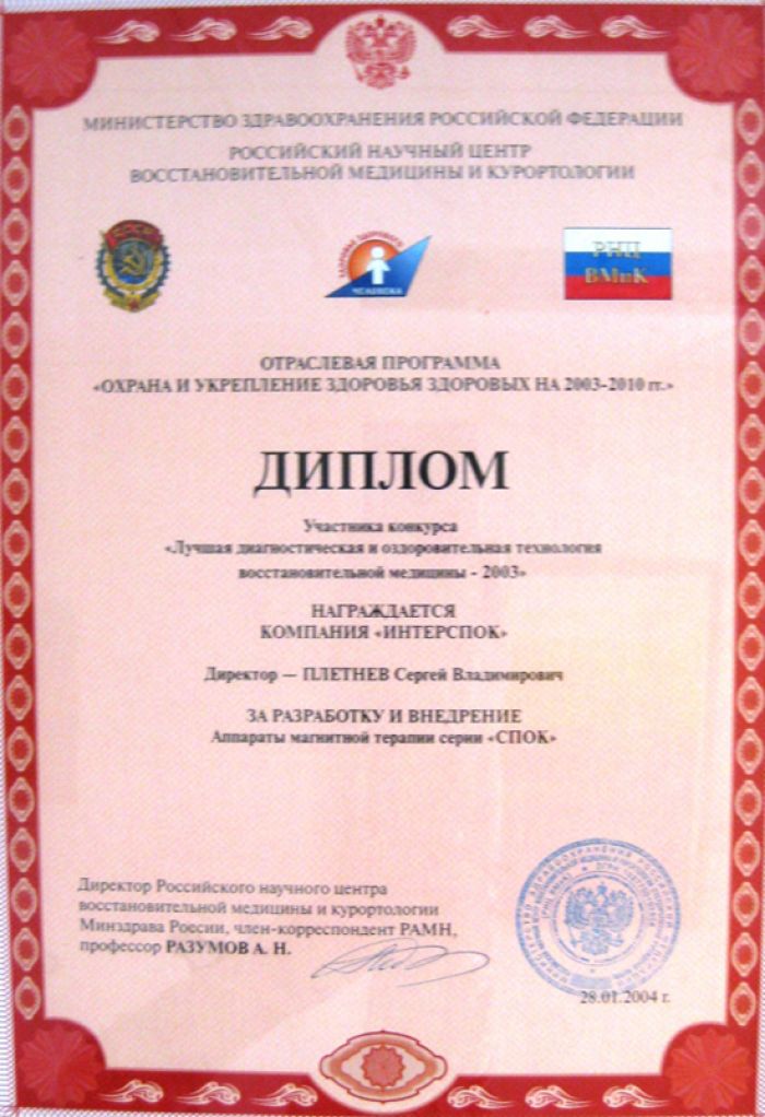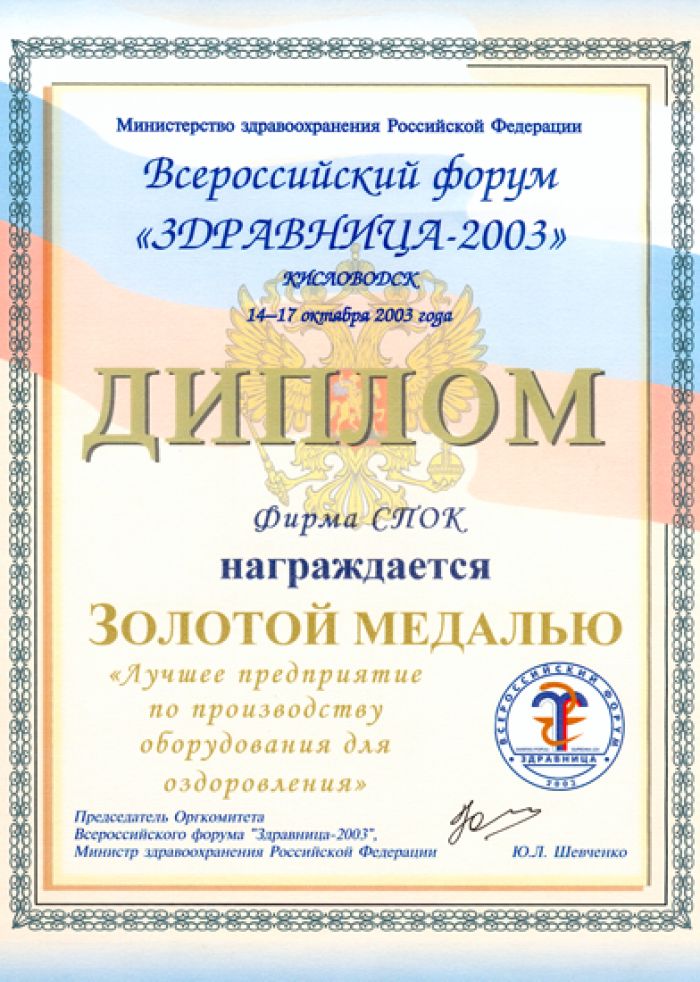 • Диплом: Лучшее предприятие по производству оборудования для здоровья 2003