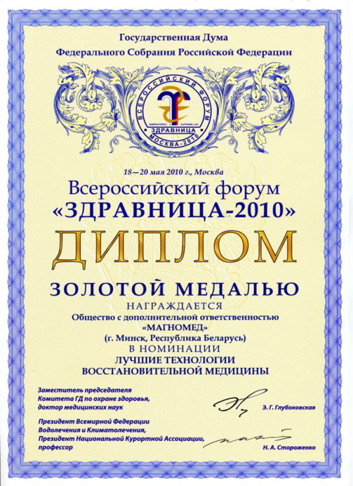 • Золотая медаль на выставке «Здравница 2010» в РФ