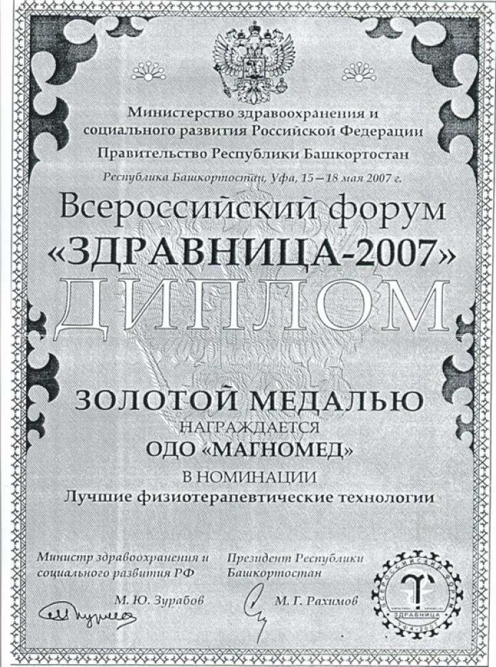 • Золотая медаль на выставке «Здравница 2007» в РФ