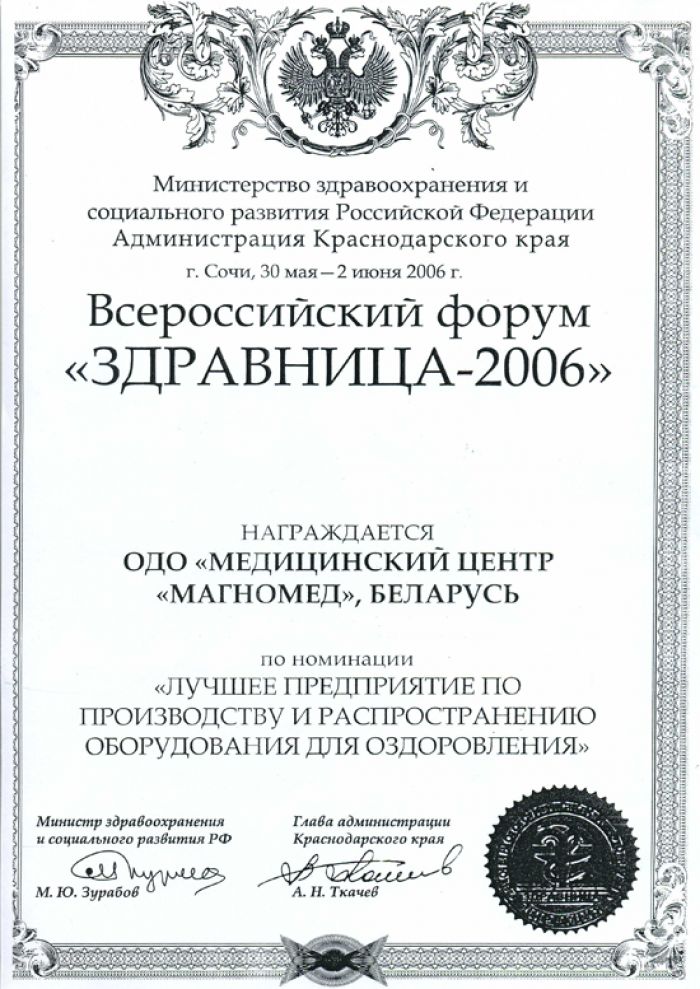 • Диплом выставки «Здравница 2006» в РФ
