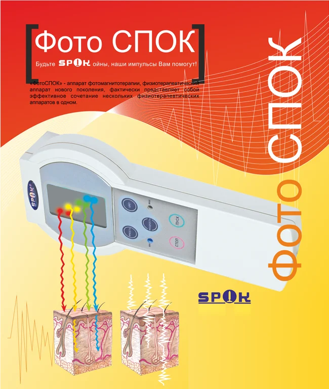 «ФотоСПОК» — аппарат фотомагнитотерапии, физиотерапевтический аппарат нового поколения, фактически представляет собой эффективное сочетание нескольких физиотерапевтических аппаратов в одном.
